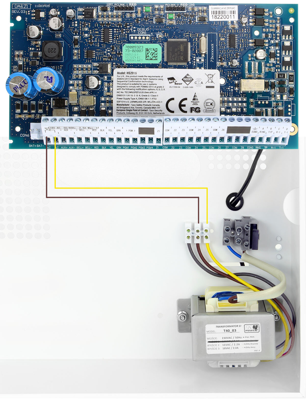 Schema voor het aansluiten van de OC40-172 behuizing op het DSC HS2016, HS2032, HS2064 moederbord: