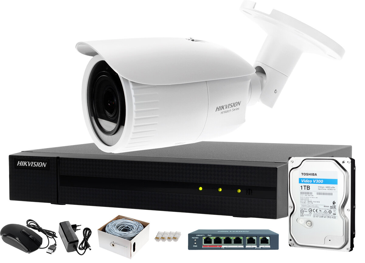 Hikvision Hiwatch Achtertuin, Plein Monitoring Systeem IP Recorder HWN-4104MH + 1x Camera 4Mpx HWI-B640H-V + Accessoires