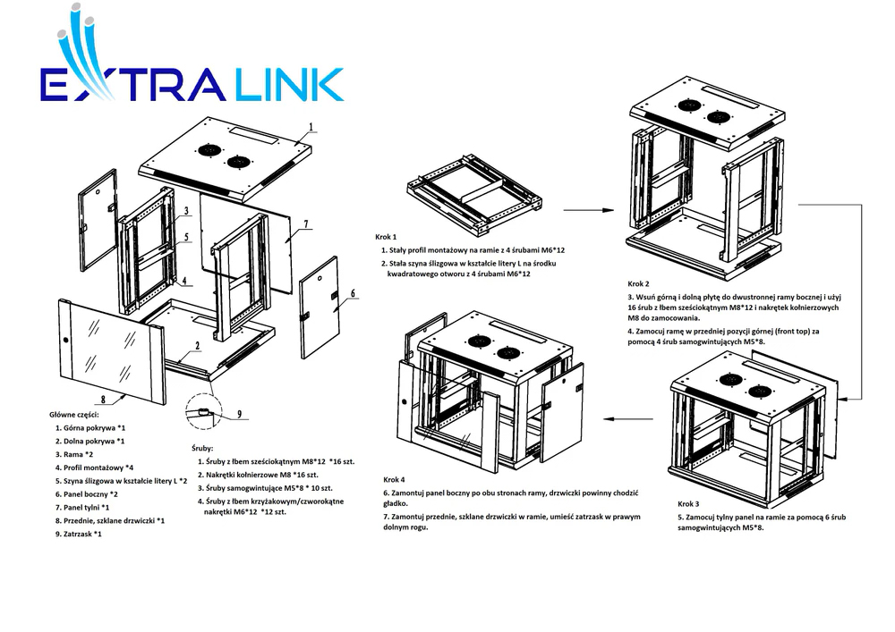 De Extralink rackkast is ontworpen voor wandmontage in kantoren, netwerkserverruimten en CCTV-controlekamers. De buitenwanden zijn gemaakt van koudgewalst plaatstaal. De voordeur is voorzien van gehard glas en kan naar links of rechts worden geopend.