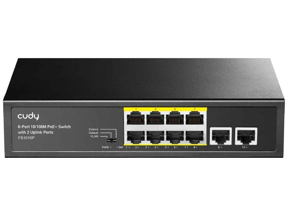 Switch FS1010P van Cudy is een netwerk PoE switch, voorzien van 8 RJ45 10/100Mbps poorten met IEEE 802.3at / 802.3af power ondersteuning en 2 Uplink poorten. Het apparaat heeft een totaal PoE-budget van 120W, waarbij een enkele poort tot 30W kan leveren. Het model heeft ook een hoge doorvoersnelheid van 2 Gbps.