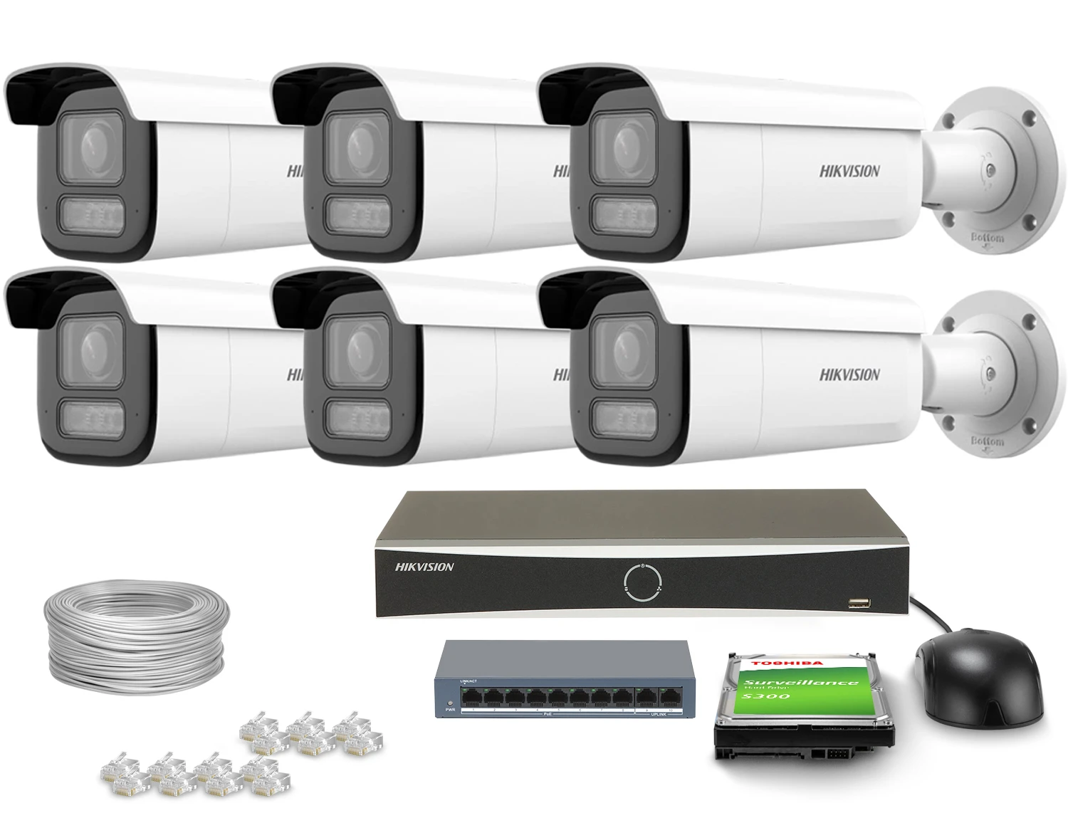 Zestaw do monitoringu 6x DS-2CD2643G2-LIZS2U, DS-7608NXI-K1(D) Smart Hybrid Light AcuSense 6Mpx IR 60m Motozoom Audio Hikvision