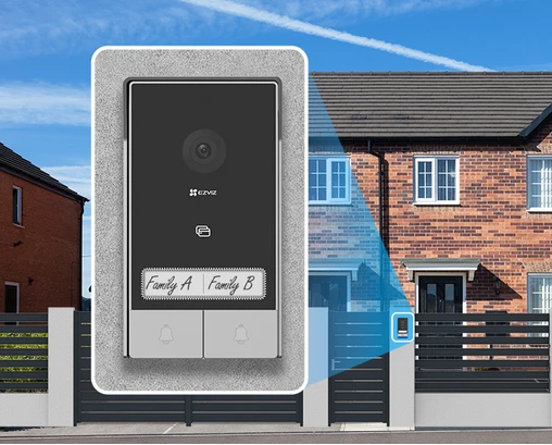 De HP7 kit voor twee gezinnen is een handige oplossing voor twee gezinnen die gebruik maken van één ingang. Een bezoeker kan kiezen welk huis hij wil bellen door een van de twee knoppen op de externe intercom te selecteren, die ook werkt als een camera die video opneemt en menselijke bewegingen detecteert - zodat bewoners meldingen ontvangen op hun telefoon nog voordat de bezoeker op de bel drukt.