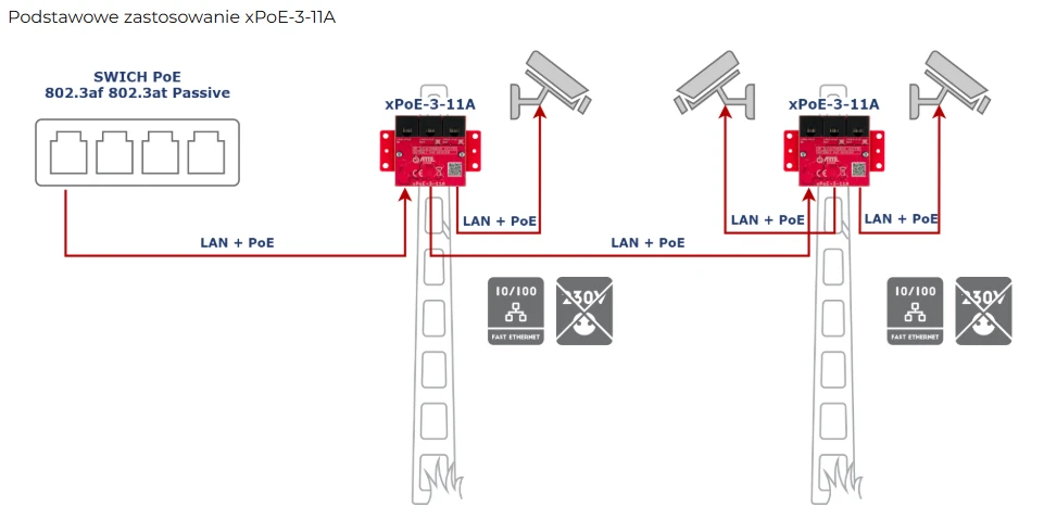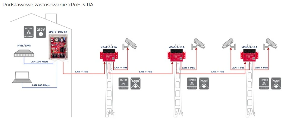 xPoE-3-11A został zaprojektowany jako extender (repeater) sieci LAN oraz zasilania PoE. Regeneruje sygnał sieciowy i przenosi zasilanie PoE na wybrane wyjścia. Najczęściej stosowany jako "wzmacniacz" do przedłużania sieci na odcinkach dłuższych niż 100m. Dodatkowo nadaje się idealnie jako "aktywny rozdzielacz" w sytuacjach, gdy na jednym przewodzie potrzebujemy uruchomić kilka odbiorników PoE (np. kilka kamer IP), lub gdy potrzebujemy stworzyć dodatkowe odgałęzienie sieciowe.